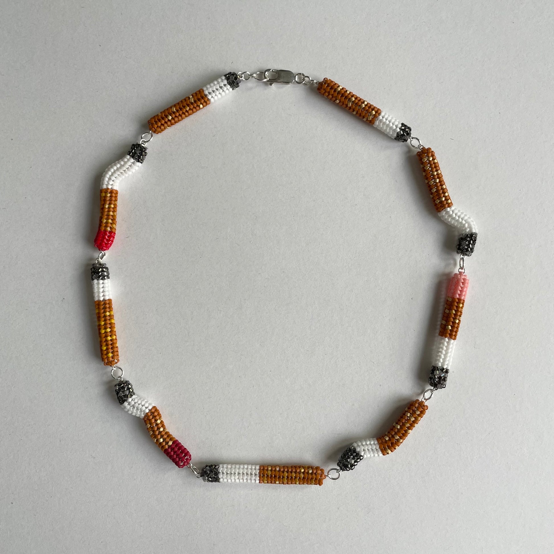 Meticulously hand-beaded cigarette butt links, chained together with sterling silver hardware and clasp.