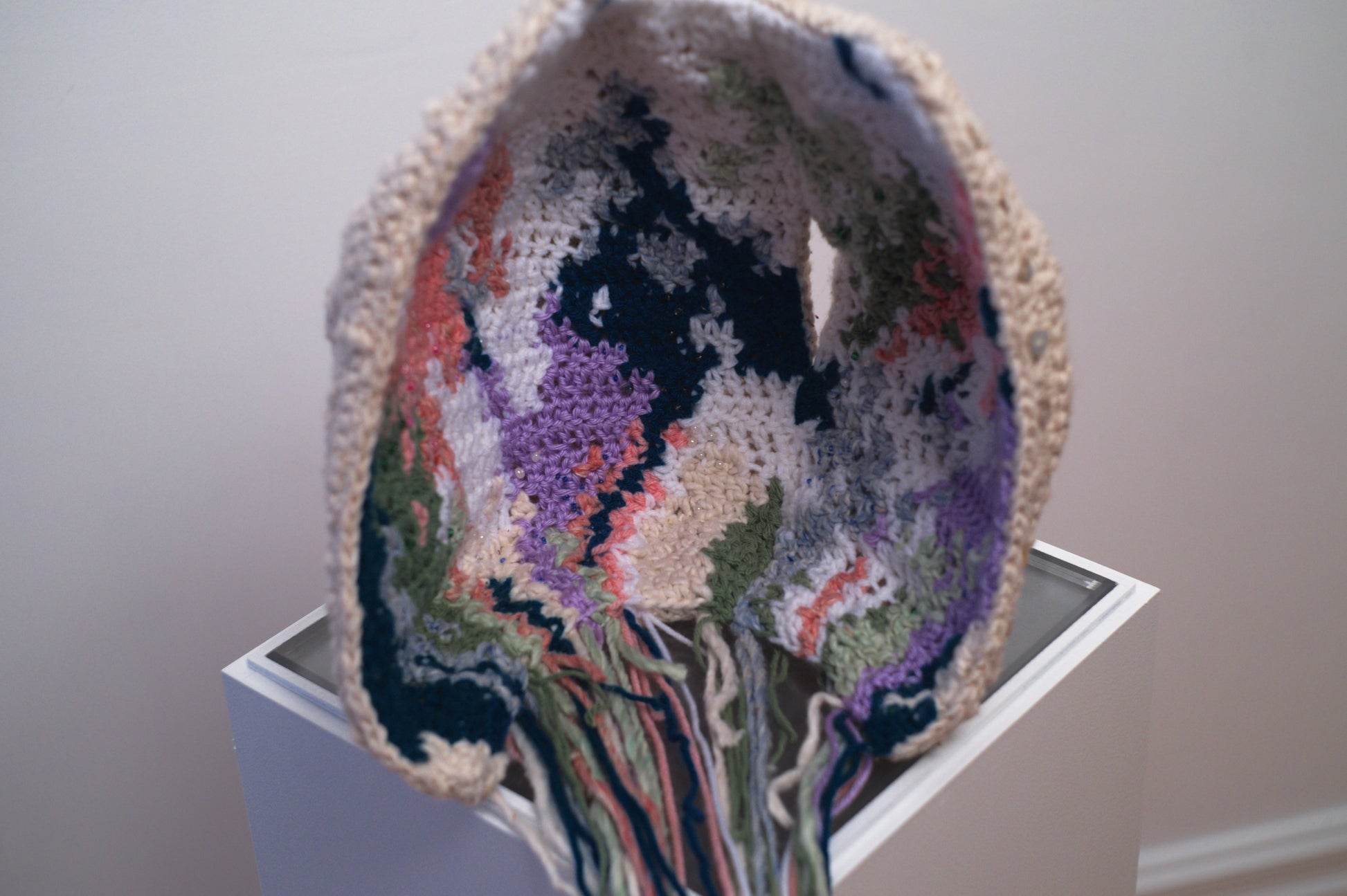 3-dimensional crocheted cocoon sculpture with a neutral shell on the exterior and a vibrant explosion of colour inside.