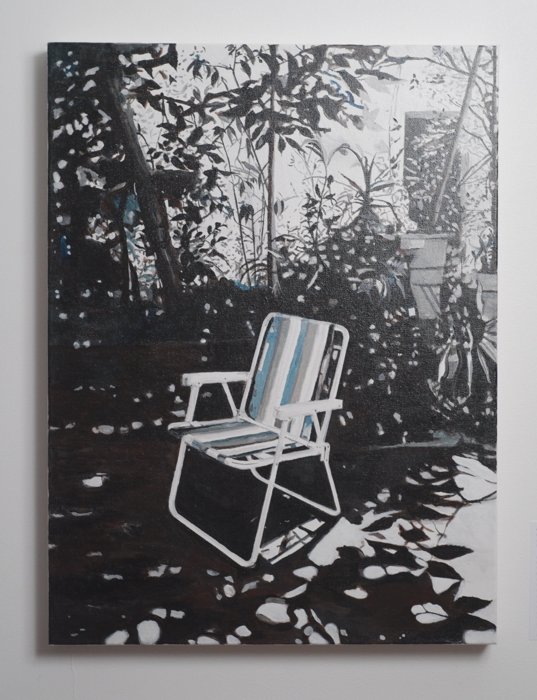 An outdoor chair surrounded by vegetation, suggesting presence without portraying a figure.