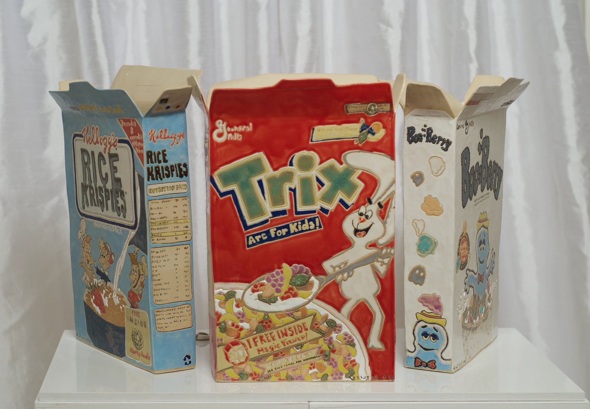 Life-sized ceramic cereal boxes, bowl and spoon, complete with cereal bits and spilled milk.