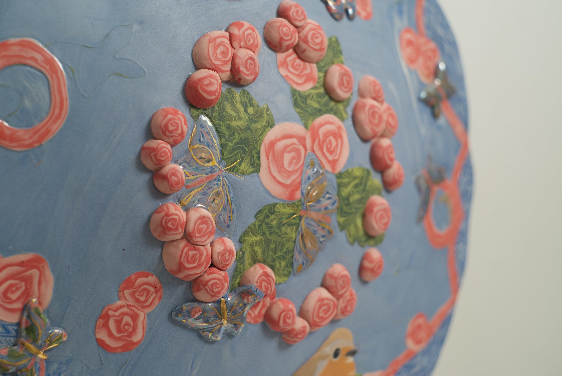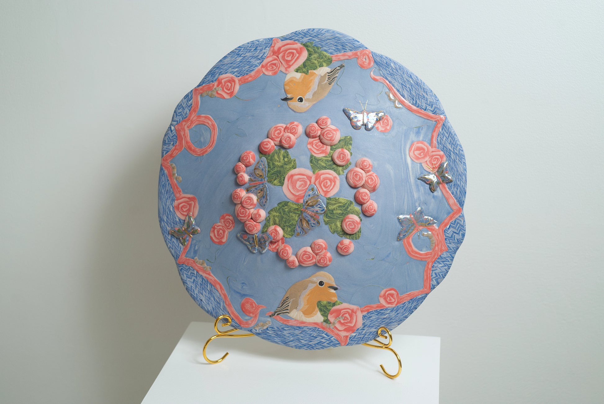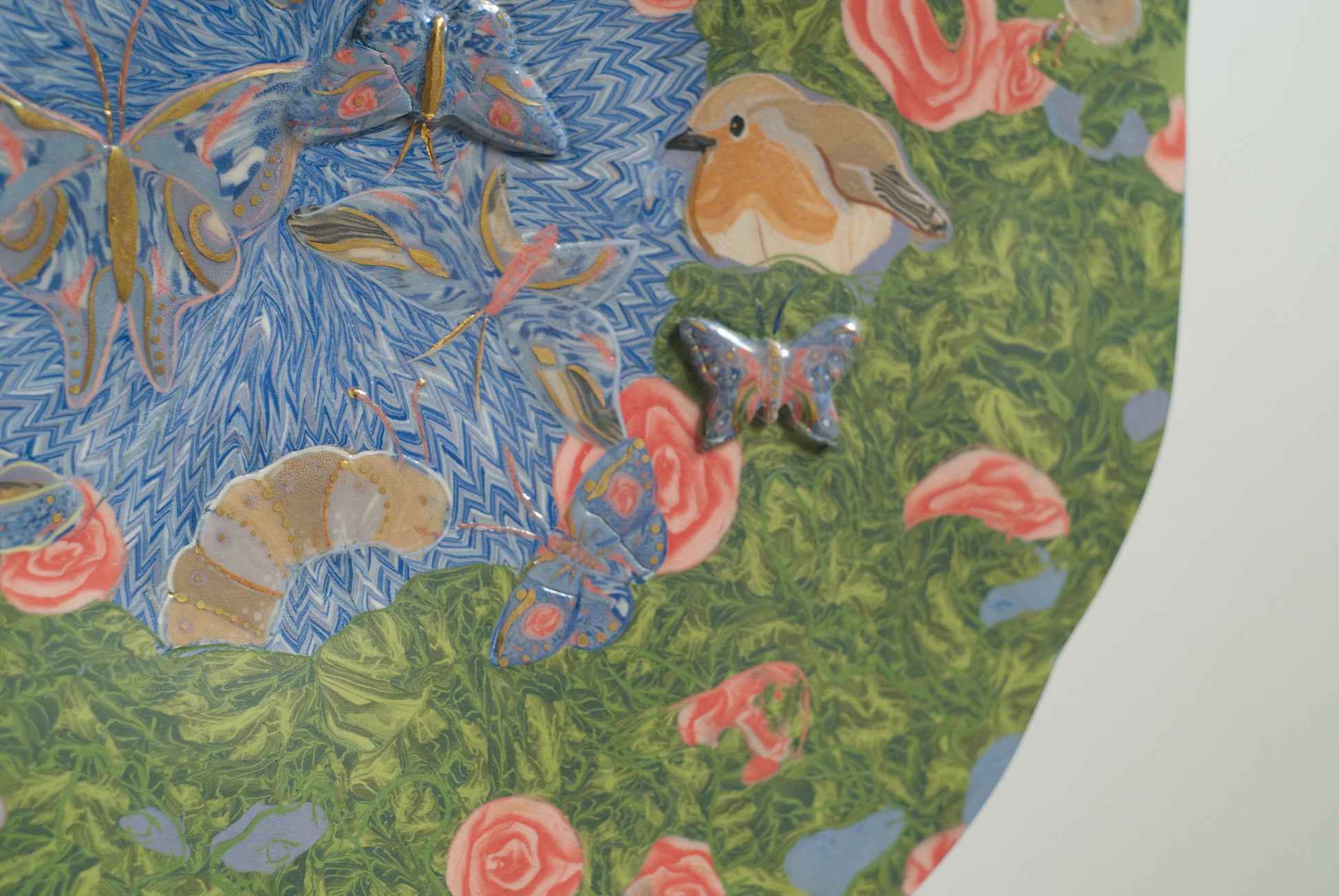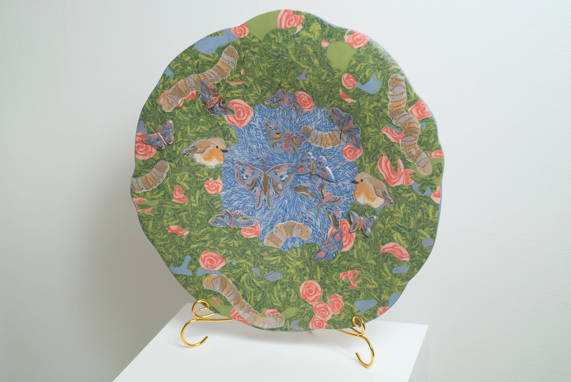 Ceramic plate in pigmented clay, rendered in the nerikomi technique, accented with 3d texture and lusters.
