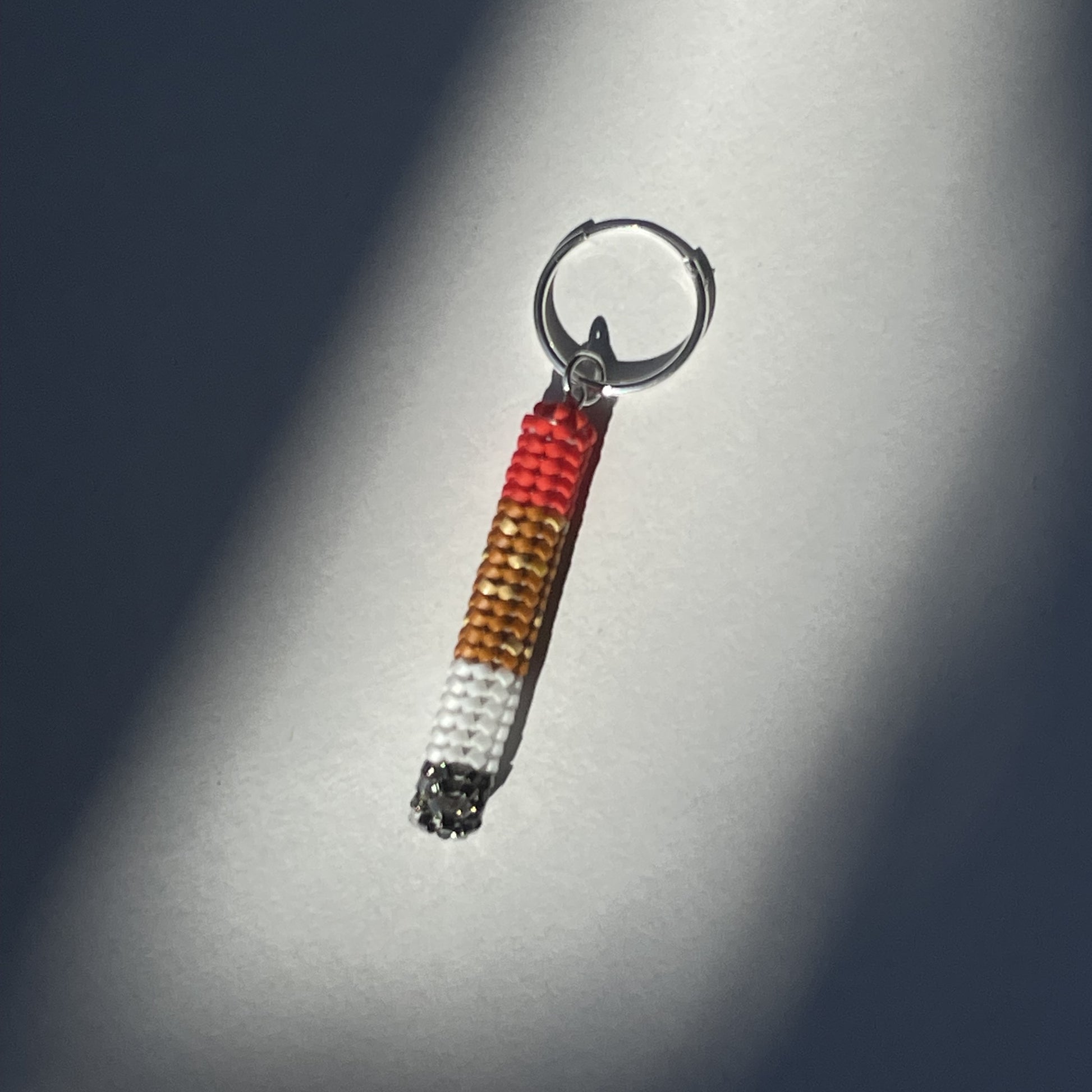 Single hand-beaded classic cigarette butt earring hanging from a 5/8" hoop.