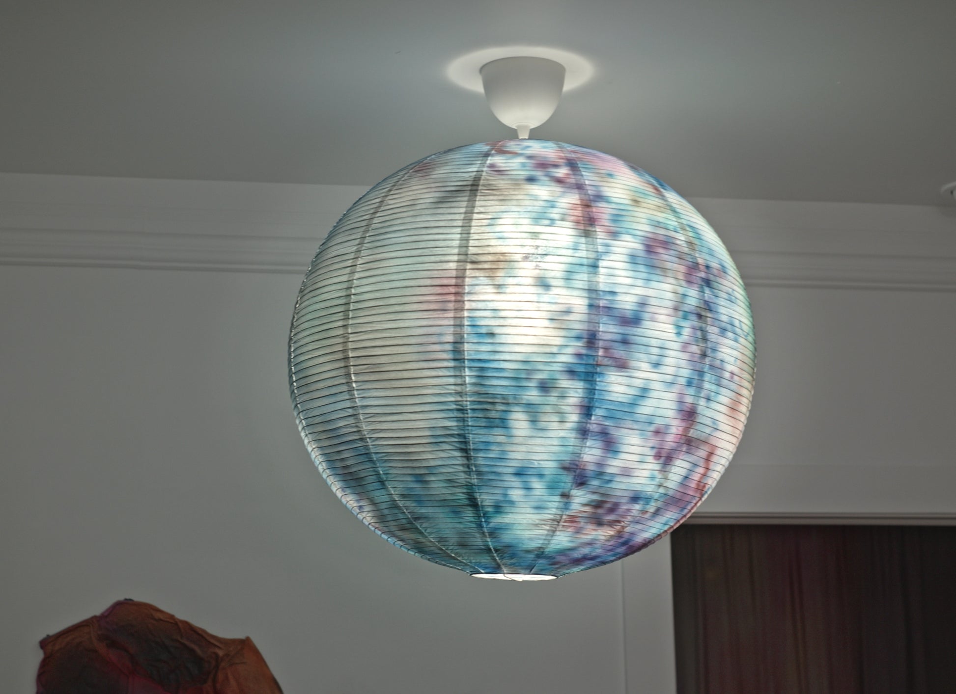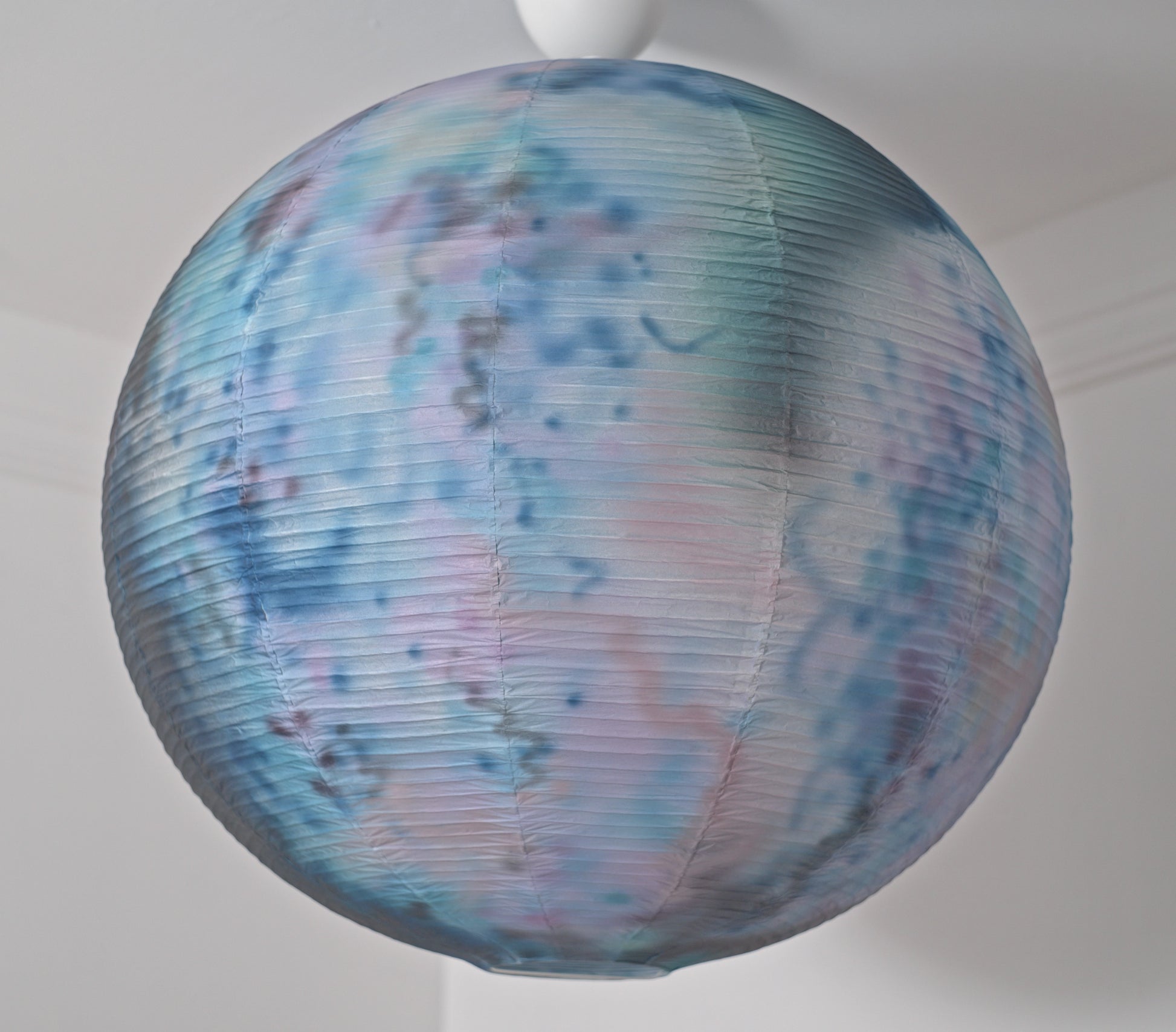 Handpainted hanging lamp with colours and patterns emulating the petals of an orchid.