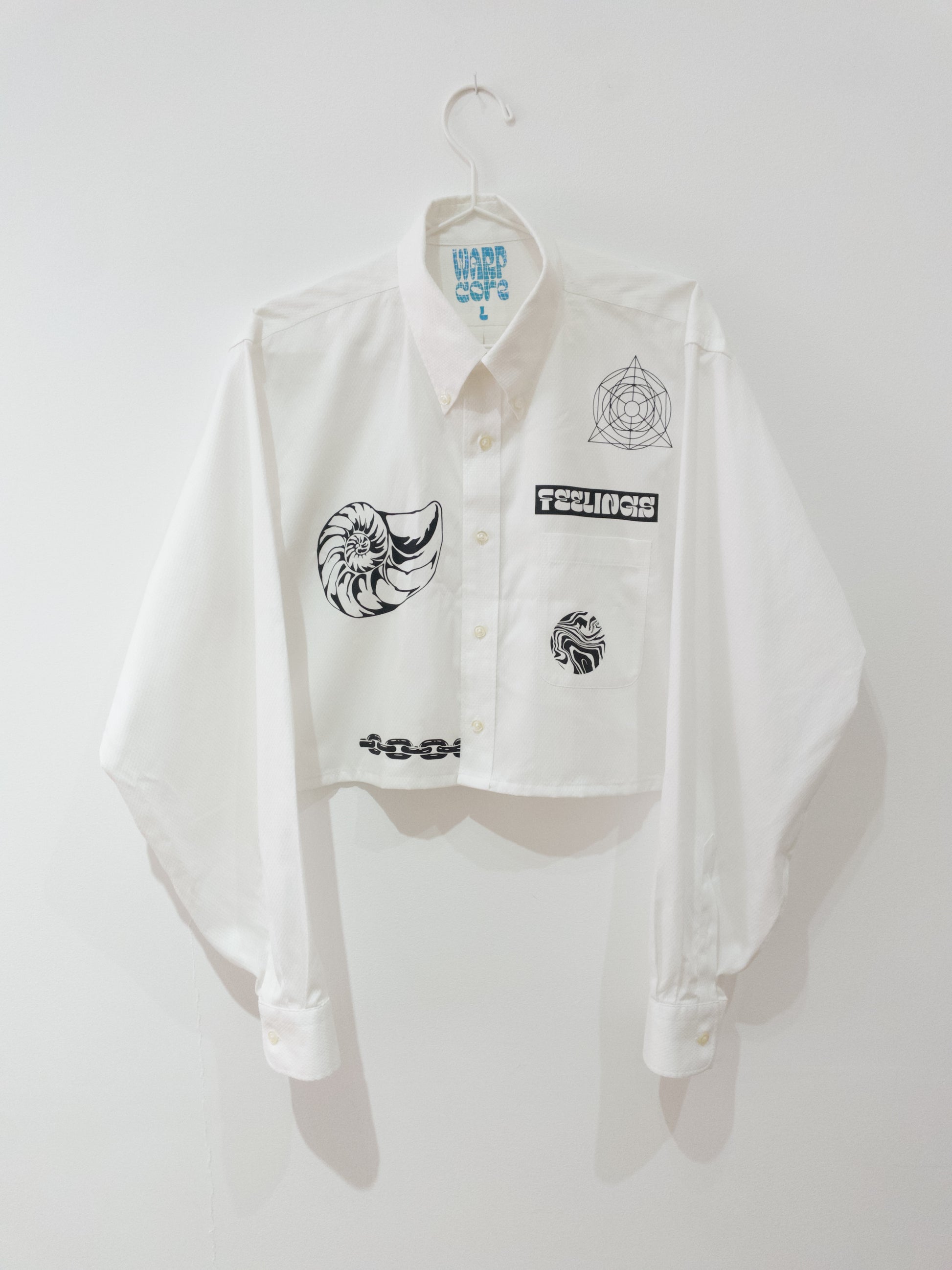 Cropped one-of-a-kind upcycled textured white long-sleeve button-up shirt featuring heat-transfer vinyl imagery of